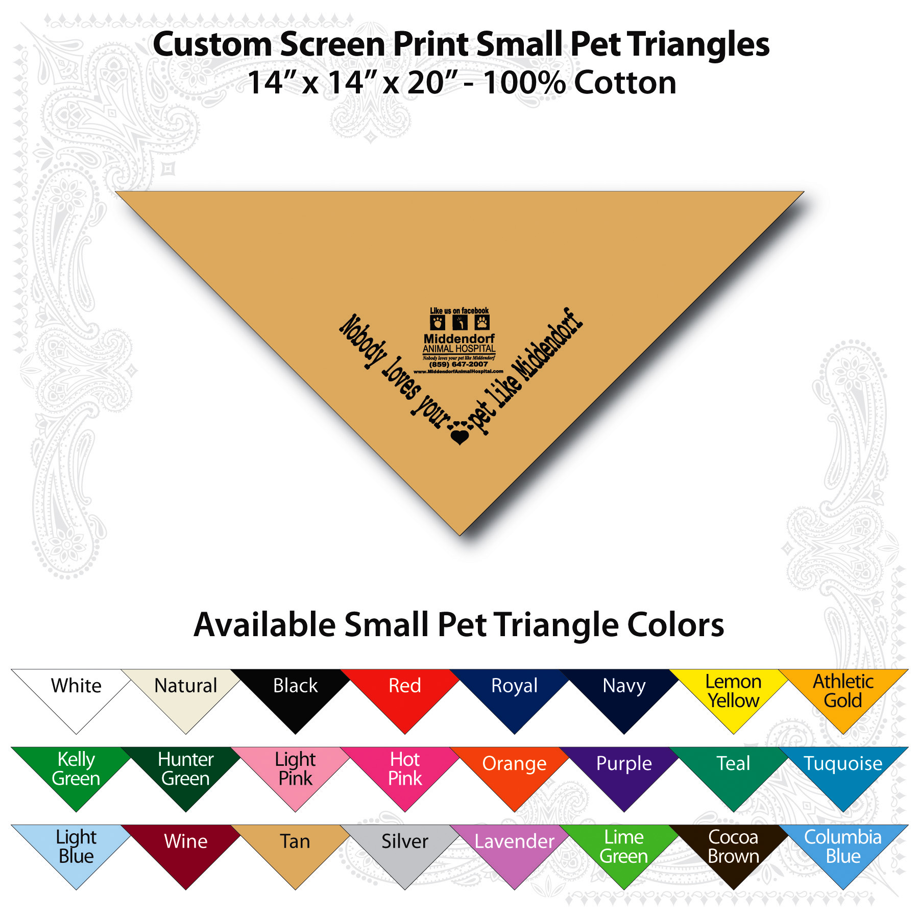 Triangles are perfect for promoting pet products and animal charity functions. There are lots of ways to use this special bandanna! Think of using them to identify event participants, or as children's party favors. Add one of our specialty borders or create your own by using our solids and adding your logo. 14" L x 14" W x 20" H
