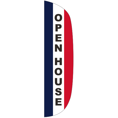Open House flutter style message feather flag. It's unique design and affordability make it a must have for any business. Made to order item. All flags are outdoor all weather durable knit polyester and are finished with a standard 3" pole sleeve. Does not include pole which must be permanently concreted in the ground and is needed for assembly. (Item # HW21FTELPO). 15' W x 3' H