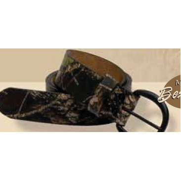 A best seller. Our camo leather belt is as genuine and rugged as the countryside outdoorsmen explore. Heavy-duty; 1.5" wide. Flat black buckle won't shine in the woods. Mossy Oak Break-Up. Available in sizes 30"-54". 1.5" W