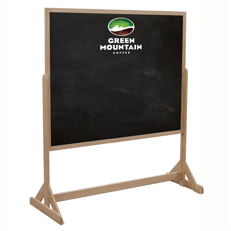 Unique floor chalkboard with well built oak frame available in 5 standard finishes. Use as a chalkboard, imprint with custom artwork, or both! Custom imprinting available - Call today!. 72" L x 70" L