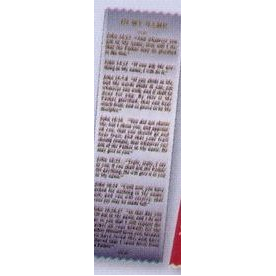 2 1/2" x 8" Bookmark Ribbon with "IN MY NAME" poem printed in gold metallic foil. Ribbons are packaged in bundles of 100. Item comes as shown, or Bookmark can be personalized with up to 4 lines of text for add'l cost. 2 1/2" W x 8" L