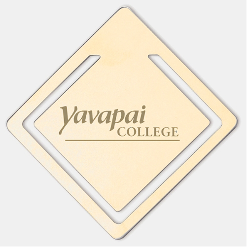 0.018" Standard gauge diamond shape bookmark in polished brass and poly bag packaging. 2 3/4" W x 2 3/4" H x 0.018" Thick