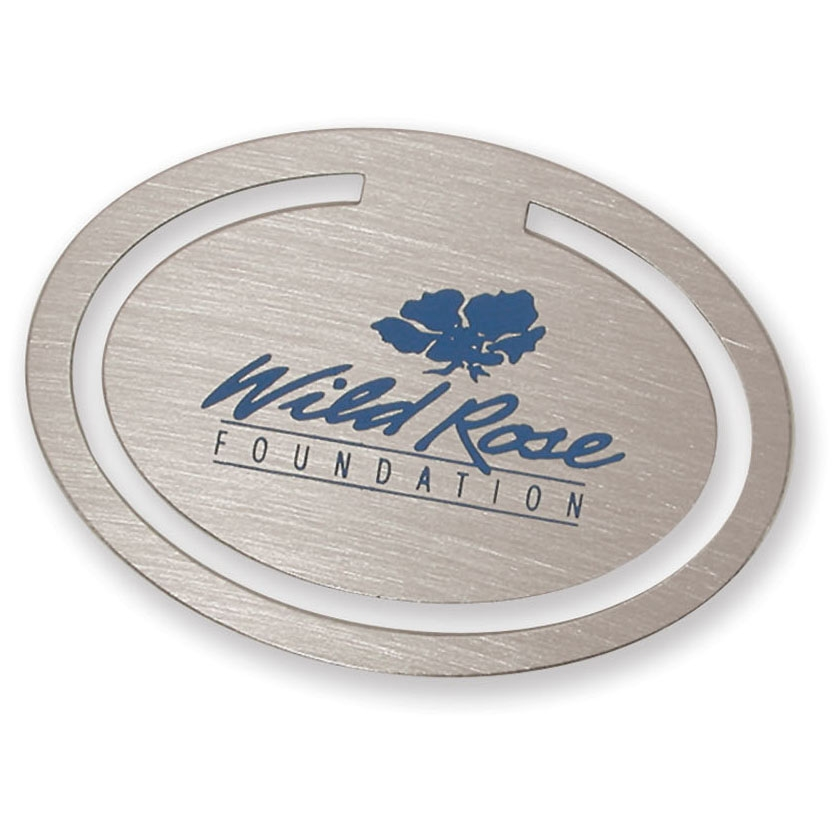 0.018" Standard gauge oval bookmark in brushed gold or polished silver and poly bag packaging. 2 1/2" W x 1 3/4" H x 0.018" Thick