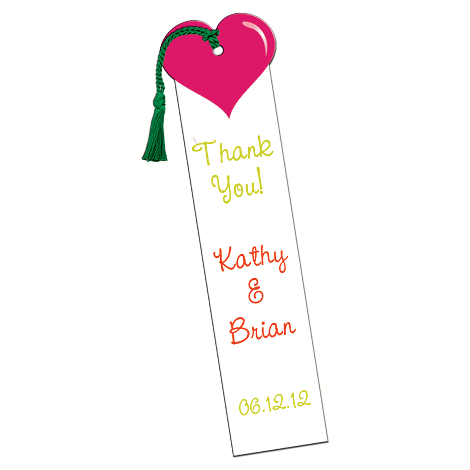 Heart keepsake bookmark and tassel. USA made wedding keepsake bookmark. Film laminated on both sides for extra durability. A keepsake your guests will remember and use again and again. Complies with CPSIA. 1.75" W x 8" H