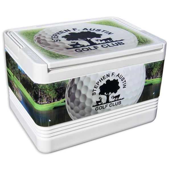 The Igloo DuoDeco 12 can, 9 quart cooler, features full color lid print and vinyl wrap. Ultratherm insulation keeps contents cold. Lid reverses from flat surface to tray & cup holder. Bale handle for one handed carrying. Handle folds flat for storage. Designed for easy stacking & storage. Easy clean, stain & odor resistant liner. Fits in most golf cart cooler racks!. 9.5" W x 8.75" H x 13" L