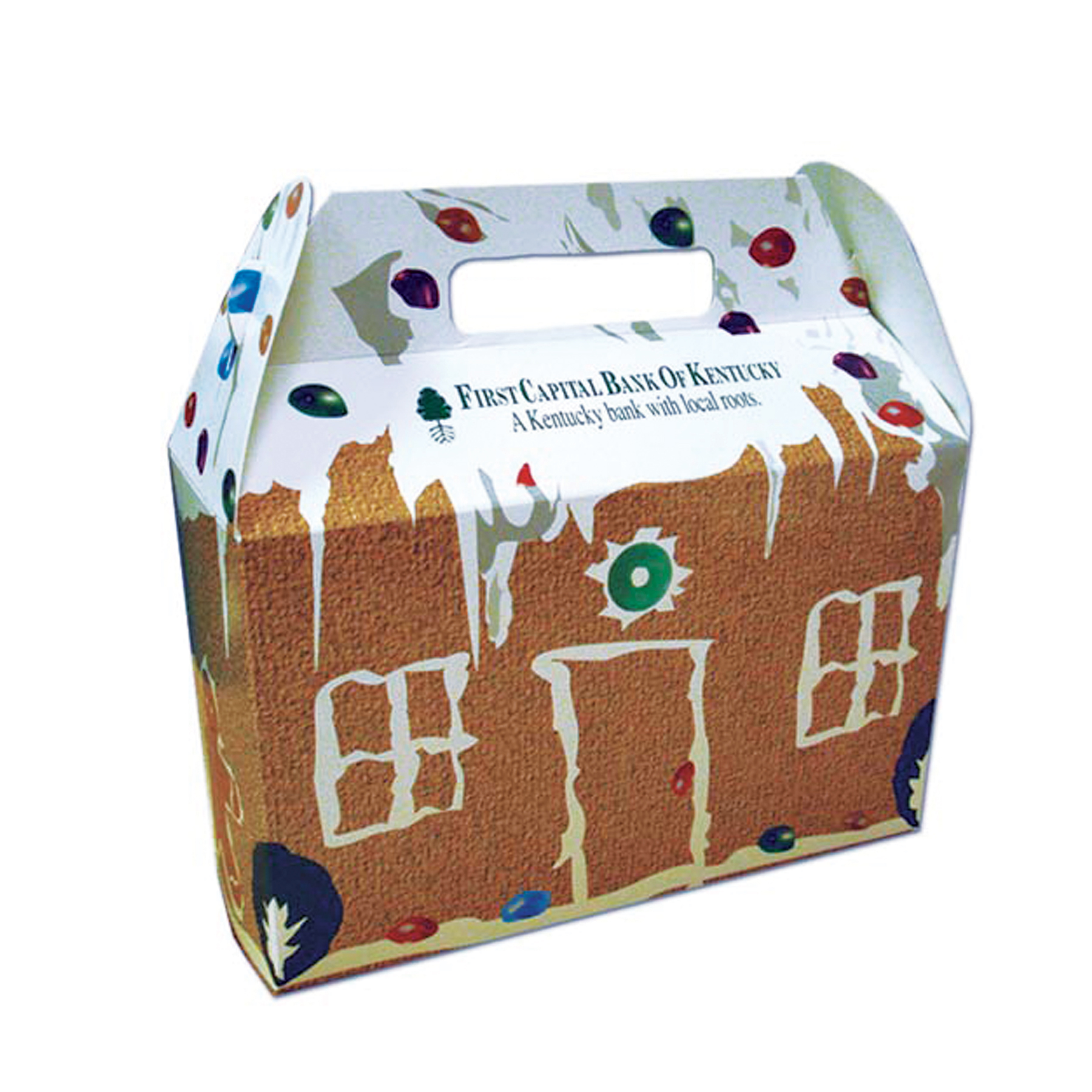 Gingerbread house preprinted design gift box. Liquid laminated for a high gloss finish. Quick turn, just ask. Carry handle for convenience. Unique, sure to get your logo noticed during the holiday season. Complies with CPSIA.
