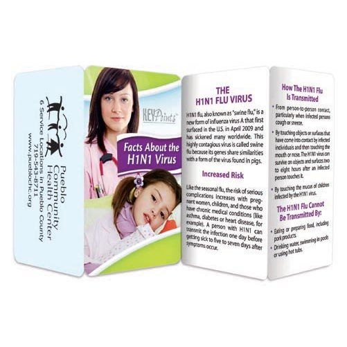 Have you ever wanted a quick reference about the important topic of the Swine Flu or H1N1 Virus and how to avoid or what to do if contracted? This handy, take-along reference guide is great at educating about this potential endemic in the United States. It discusses the H1N1 virus, symptoms, treatments, how to protect yourself and much more. USA made. Fits in #10 envelope. 8 page format folds to the size of a credit card. Made out of quality card stock. 1 color, 1 location imprint included. 2 1/8" W x 3 3/8" L