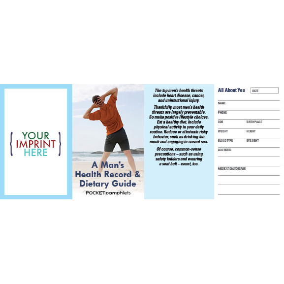 Pocket Pamphlet Informative Cards provide tips and information on any subject and fit right in your pocket! This Men's Health Guide Record Keeper pamphlet is a tri-fold pocket size informative card that has a wealth of knowledge on the subject, and folds into the size of a credit card. Everything you need to know about men's health, with a record keeper to log all of your vital statistics. Great for gyms and doctor's offices. 8" W x 3.25" H
