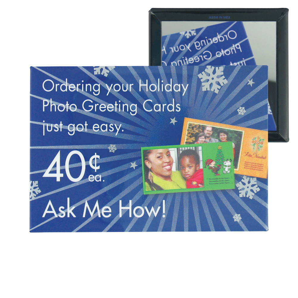 2" X 3" Rectangle Celluloid Campaign Advertising Button Mirror. Our Button Mirrors are produced using a metal shell and a full mirror back. Imprints are coated with ultra clear mylar laminate for maximum protection. 100 piece quantity minimum. To see pricing, see catalog page or call for quote. 2" L x 3" W