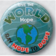 Stock, Drug Free, Celluloid, Pin Back, Round, Circle, Give the World Hope, Say Nope to Dope, World Map Accent, Earth, Drug Prevention. 2 1/4" Diameter