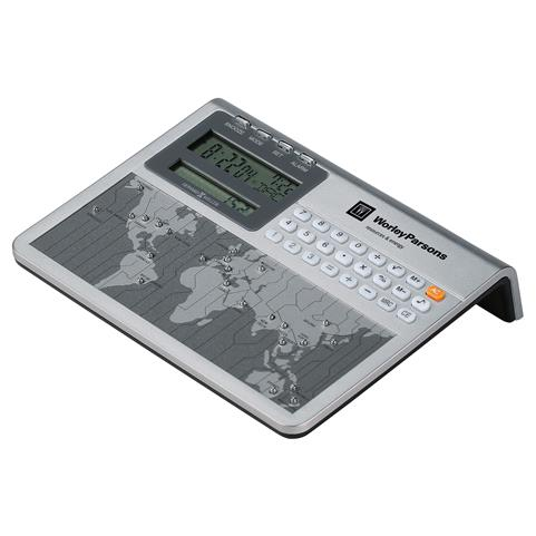This satin silver-tone finished world time alarm clock features an 8-digit calculator. Push one of the buttons on the gray and silver-tone world map to display the time for a specific area. Option to display time for 24 major cities in 22 times zones. The display shows time or month, date, year and day of the week with the push of a button. Includes snooze alarm. Quartz, alarm movement, includes one AAA sized battery. Complies with CPSIA, Prop 65. 1 1/4" H x 6 1/4" W x 5" D