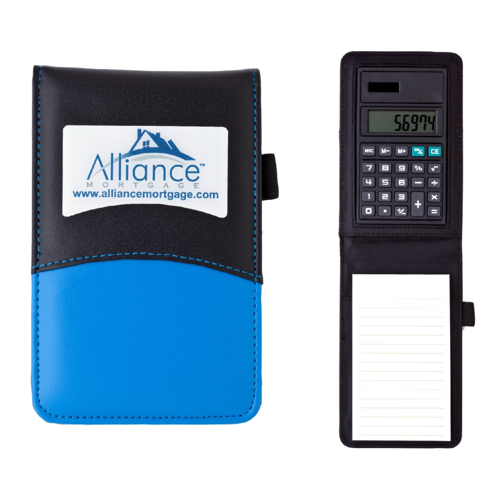 Calculate the endless marketing opportunities available to you when you select this classy promotional product! Ideal for teachers, students and executives, this two-toned padfolio comes with a solar-powered calculator and a lined removable memo pad. The calculator features a large key pad, auto shut off and memory and square root functions. Includes a four color process imprint on the cover. An ideal promo for tradeshows and conventions!. 5 3/4" H x 3 3/4" W x 5/8" D