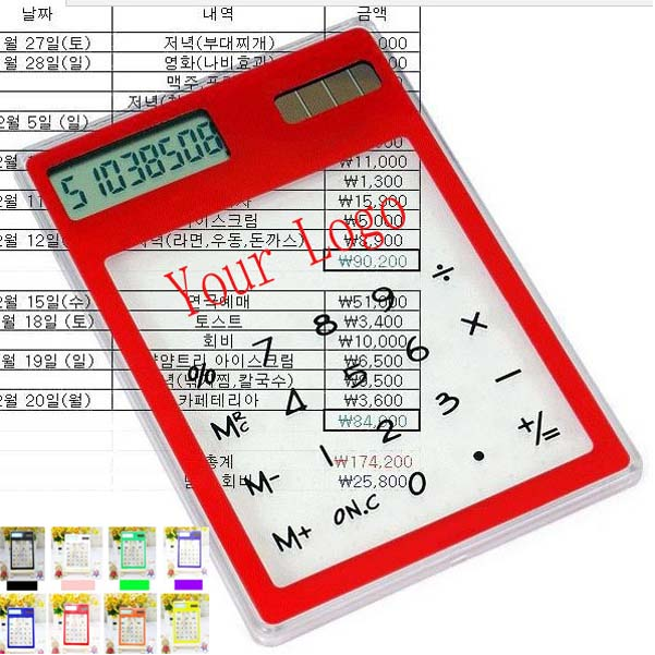 Transparent Pocket Size solar calculator with touch screen made from acrylic material is environmentally friendly and unique! Ultra Slim size and convenient to take it with you everywhere. 3 1/8" W x 4 3/4" L x 1/5" H