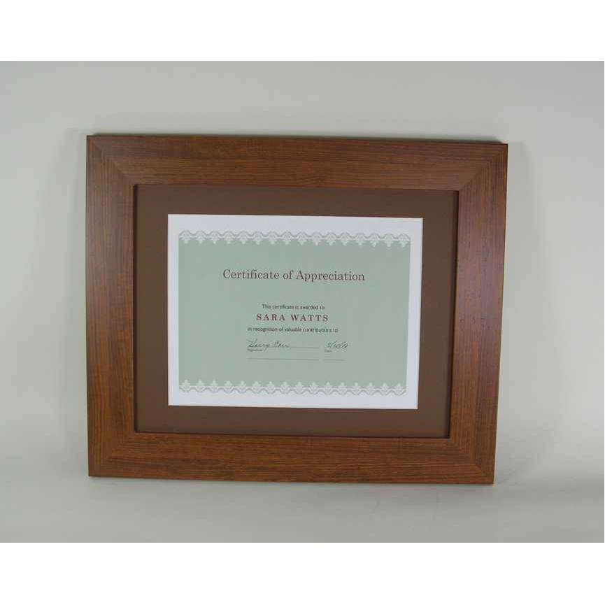 This bold certificate frame is a dark honey colored wrap over pressed wood core. It is a flat profile and is 2" wide so it is suitable for an imprint or plate on the frame. It comes complete with styrene facing, single mat with an opening to fit an 8.5X11 certificate, backer and hanger. Your choice of colors on the mat. You could also do an imprint on the mat if you choose. All imprinting is extra. Please call for a quote. 11" W x 14" L