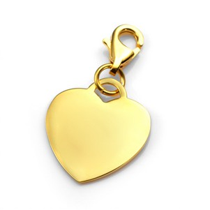 This Gold Plated stainless steel heart charm can be engraved on front and back with a monogram, symbol or message. Attach to a favorite bracelet - lobster clasp opens up to 2mm wide. If you choose a monogram or symbol do not combine with text on same side due to space. Plating is 18K gold. Please use a soft cloth without chemicals to clean gold plated jewelry. Polishing cloths available from StickyJ contain chemicals that may penetrate the surface and remove gold plating. 3/4" W x 3/4" H