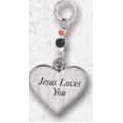 Charm meant for a key ring in the shape of a heart that says, "Jesus Loves You" with beaded embellishment.