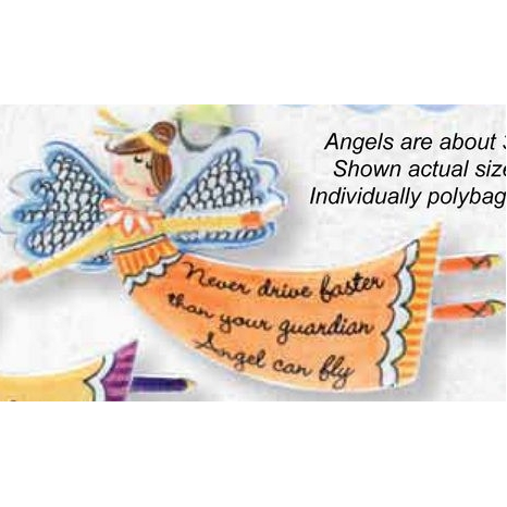 A treasured keepsake for the Angel in your life. Ornament is in the shape of an angel that says "Never drive faster than your guardian Angel can fly" on her front. Features a wing-shaped charm at the end of a white hanging ribbon. The back of each piece is also sculpted like the front with hand-polished, bright-finish metal. Artwork by Carol Eldridge.