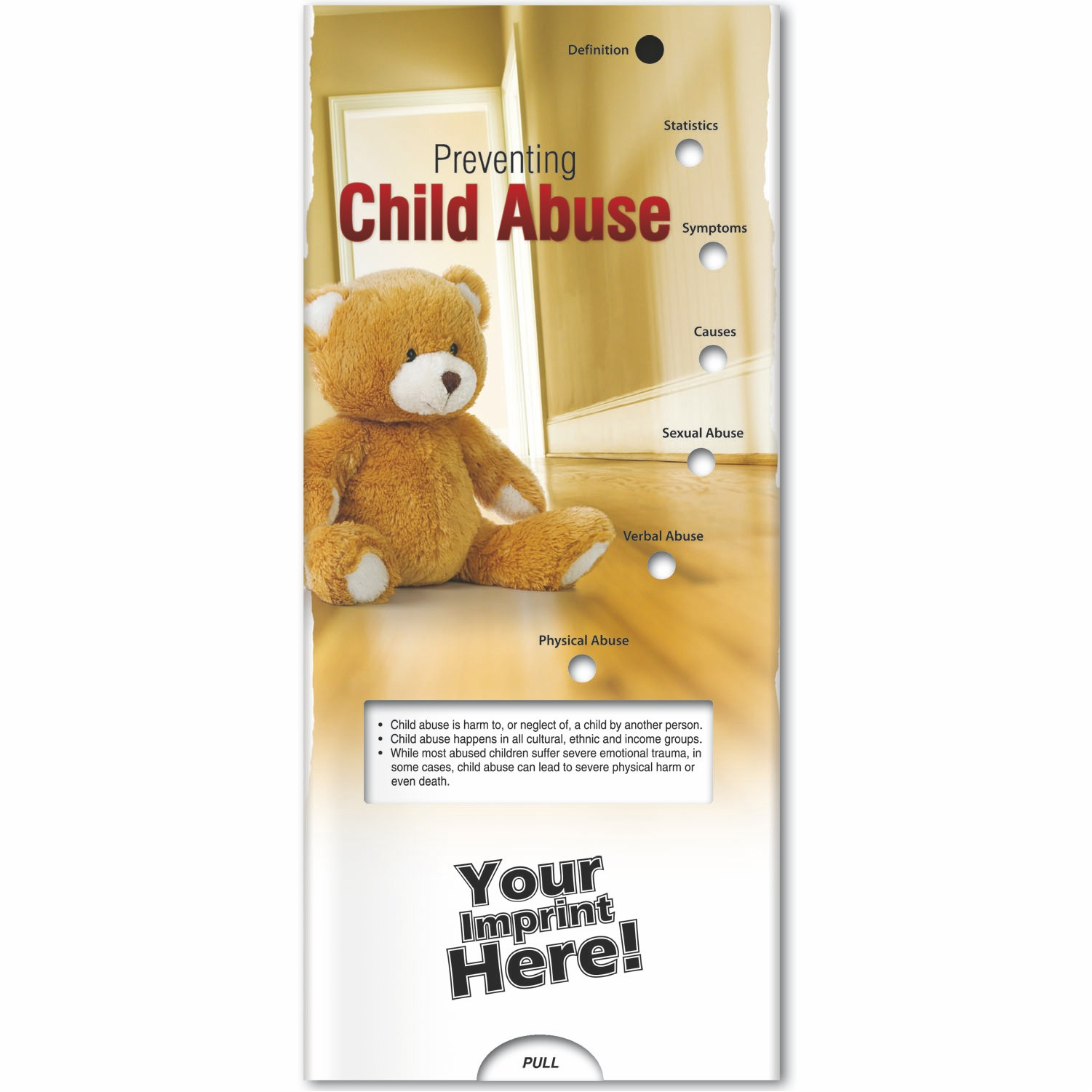The first step in getting help for abused or neglected children is recognizing certain signs. This Child Abuse Pocket Slider gives you the knowledge to detect symptoms of abuse and ways to prevent it. Complies with CPSIA. 3 3/4" W x 8 1/2" H