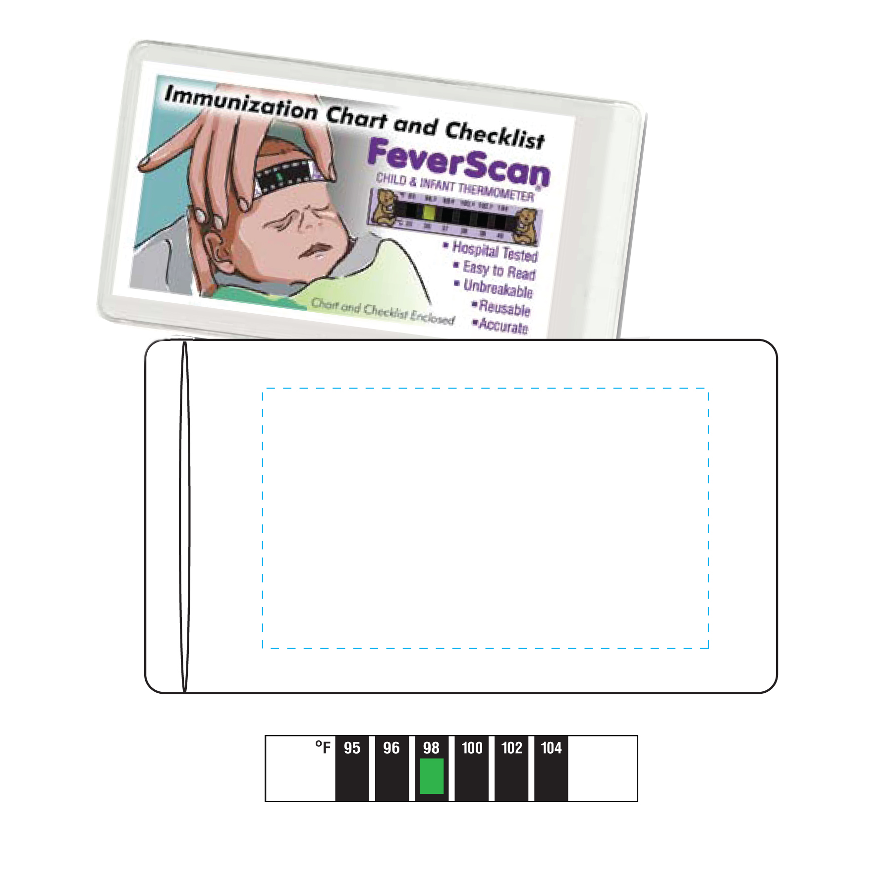 Reusable Mini Fahrenheit only Feverscan Forehead Thermometer with Immunization schedule and personal record chart included. Thermometer nestled in folded chart. Imprint on back of instruction. Packaged in a clear vinyl sleeve. Complies with ISO 13485. 4 1/4" W x 2 5/16" H
