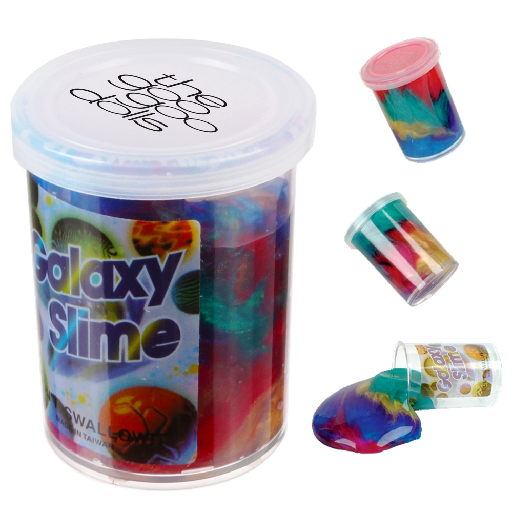 Mold your brand to have a new image of fun in the eyes of your clients by offering them this Galaxy Slime. This jar holds a multicolored sludge that's certain to provide hours of fun for anyone no matter their age. It's a putty-like material that's out of this world. This is a perfect party favor for any occasion and is sure to garner laughs and keep clients talking. Take a step into the future of your company and purchase now!. 2 1/2" H