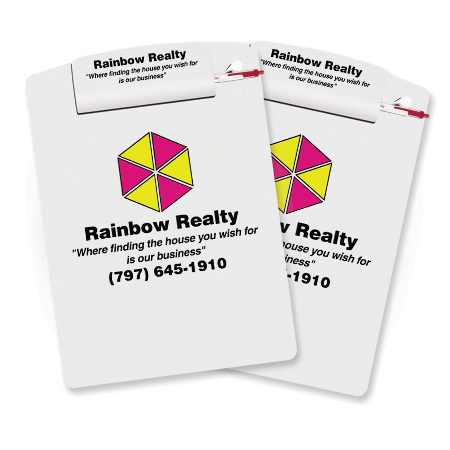 A smooth writing surface combines with an extra-large clip to create a safe and secure recording tool. Convenient, backside, hanging hole; pencil clip; individually poly bagged. Abundant copy space on the clip plus additional copy can be added to either side of the writing board. Additional charge of .40 g to print on board. 9" W x 12 1/2" L