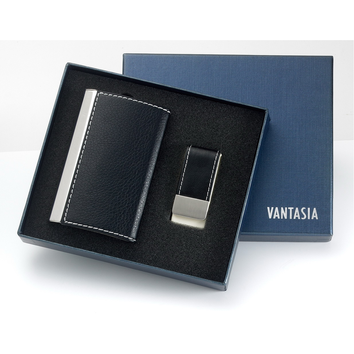 Black PU Leatherette Metal Card Case with Curved Horizontal Opening with Matching Black Money Clip in 2-Piece Gift Box. 5 1/16" W x 5 3/16" H x 1" D