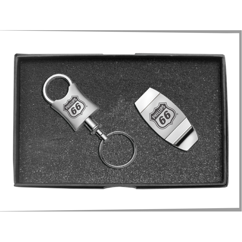Two piece gift set. Satin silver valet keychain and two toned, stainless steel, tensioned money clip. Comes in a black gift box.