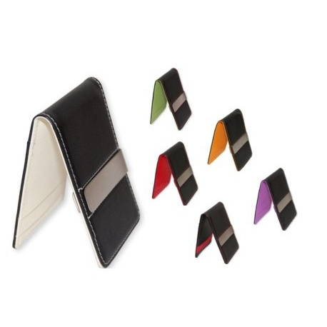 Leather Wallet with Money Clips is with two Card Holders, Made with Genuine Leather. Metal Clip to keep your Money safe. Could Engrave logos on the holder side or Surface. 4 5/16" L x 2 7/8" W