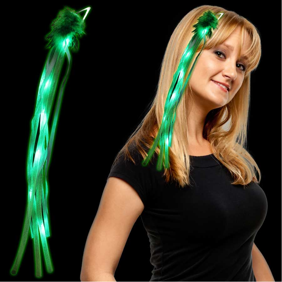 Light up your hair with LEDs and white ribbons. Each green marabou hair clip has white ribbons and 7 bright green LEDs. Perfect to use on the side, in the back or wherever you want to accent your hair style with lights. Terrific for St. Patrick's Day events. Batteries are included and installed. 15" L