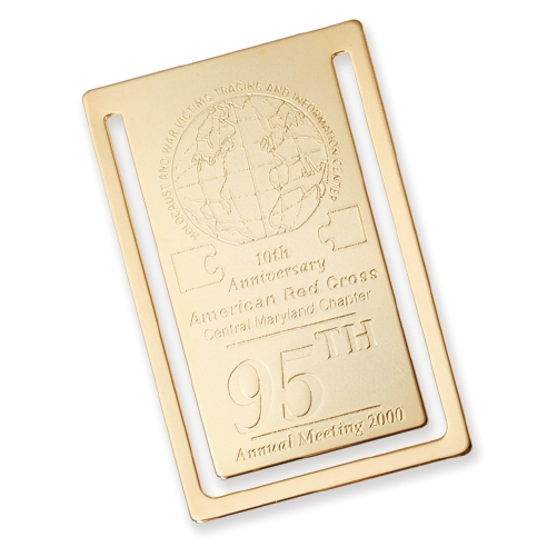 0.040" Heavy gauge vertical rectangle bookmark in polished gold with poly bag packaging. 1 3/4" W x 2 3/4" H x 0.040" Thick