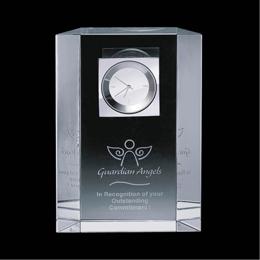 Beautiful optical clock beveled towards the back of the piece. Chrome clock face. 5" H x 3 1/2" W x 1 1/2" Thick