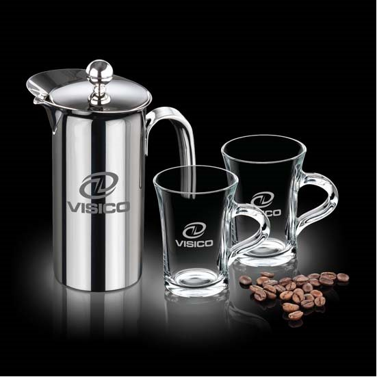 Spectacular Stainless Steel French Coffee Press Set. Restaurant Quality 18/8 Stainless Steel makes this an exquisite gift that will be cherished for years to come. Available with 2 or 4 coffee mugs. Other styles available.