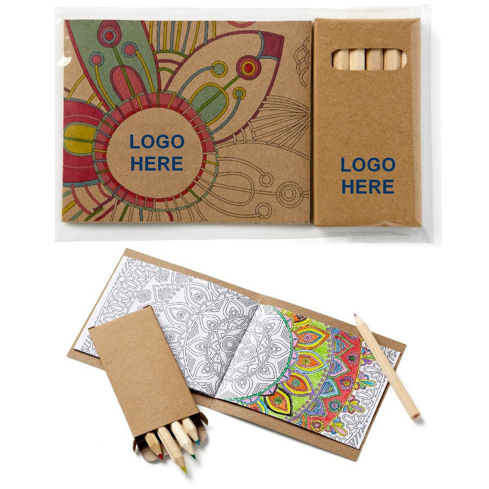 Our 4-1/4" x 3-1/2" Adult Coloring Book-To-Go & 6-Color Genuine Mini Wooden Pencil Set features a kraft brown paper cover and 32 coloring pages, in a variety of stress relieving patterns. Each set is individually polybagged. These books let you relax, focus and enjoy the simple pleasure of coloring. Pencils are pre-sharpened. Prices include your logo and copy imprinted on both the outer book cover and on the pencil set. NOTE: A white imprint is NOT available on the coloring book. 4 1/4" W x 3 1/2" H