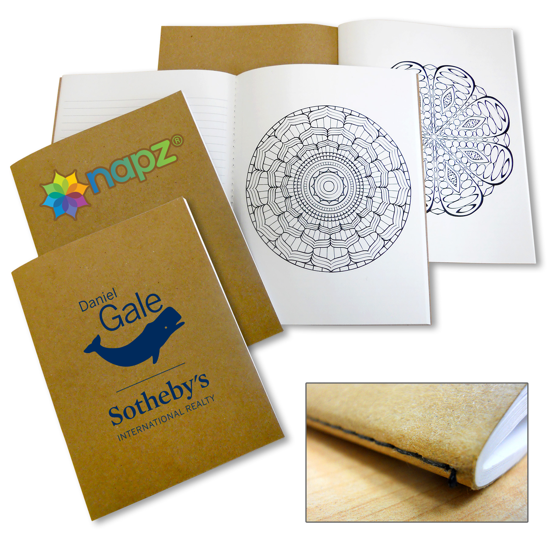 USA MADE. Exclusive Design.Our iD50108dle5798841504Mandala Notepad includes 16 pages of intricate Mandala designs to color, alternating with 16 pages of double-sided lined notepad paper. Kraft cover with center stitch binding provides a charming handmade appearance. Other cover styles and interior page options are available. use at home or at your desk, for travel, spas, hotels, seminars, conventions, gift shops, retail environments, educational associations, rehabilitation centers, and party favors. Complies with ASTM, CPSIA. 8" H x 6" W