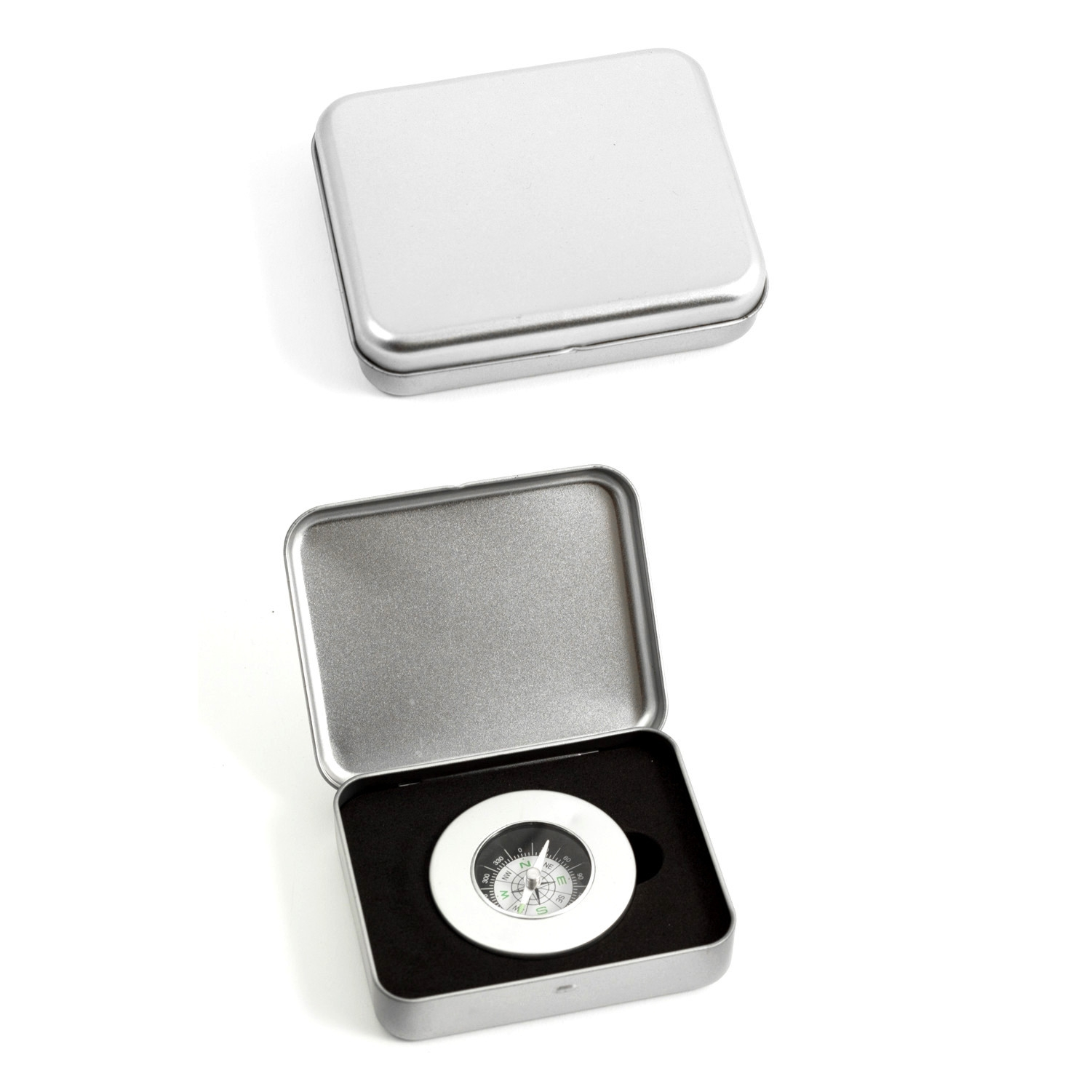 Point your customers in the right direction with this brushed silver compass! With a size of 4" x 3/4" x 3 1/2", this compass is conveniently pocket sized and comes in a tarnish proof metal box. A great gift or promotional giveaway, customize this product with a tone on tone imprint of your company name or custom logo and promote your brand on the go. Perfect for trade shows and outdoor promotions, invest in this custom compass today!. 4" L x 3" W x 0.85" D