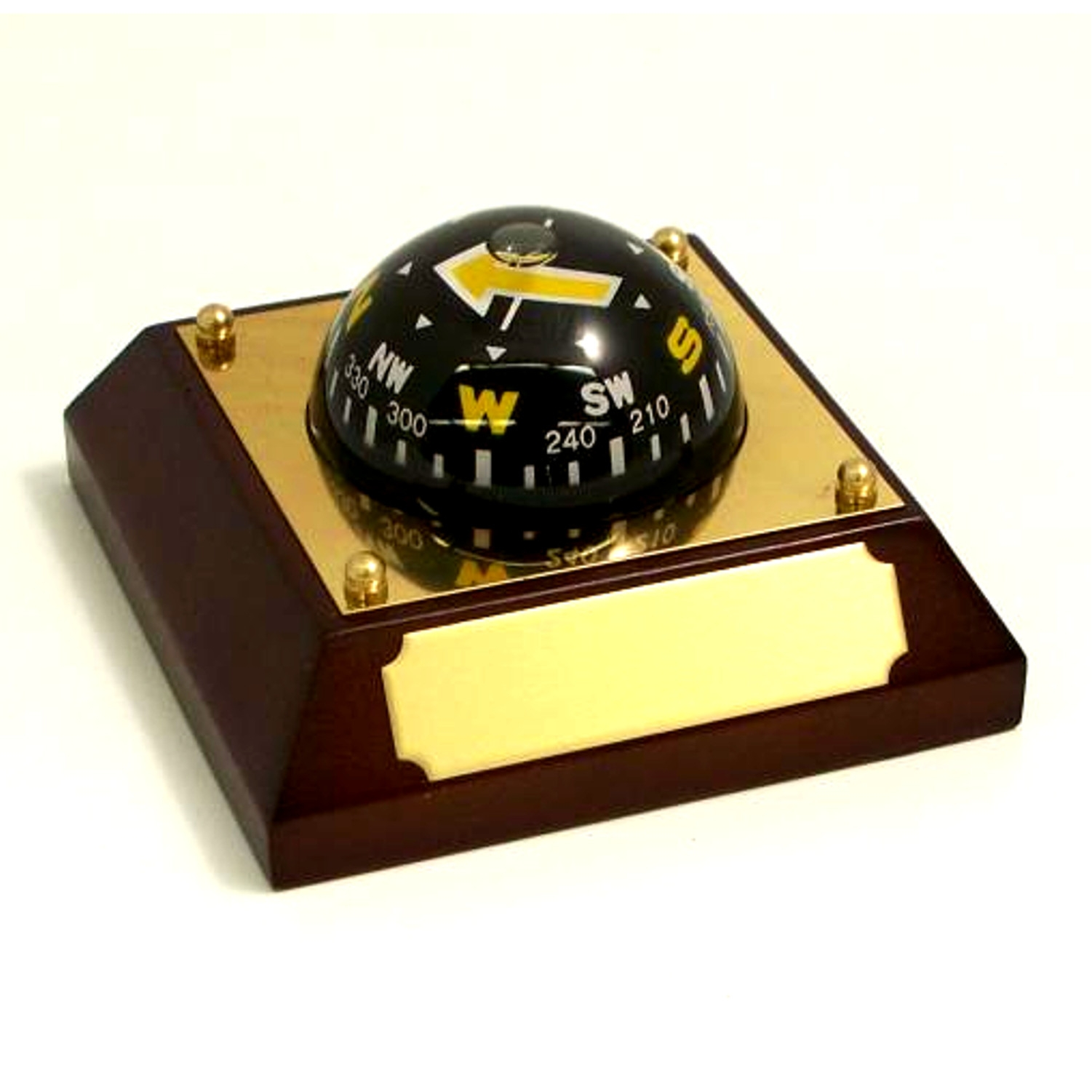 Add this eye-catching compass to your nautical collection! Measuring 3 1/2" x 2 1/4" x 3 1/2", this compass sits on wood base with tarnish proof accents. Perfect for employee recognition events, corporate giveaways and fundraisers, customize this decorative piece with a tone on tone imprint of your company name or logo for an extraordinary gift that will complement any office desk. This item comes individually packed in a gift box for your convenience. 2.25" H x 3.50" W x 3.50" L