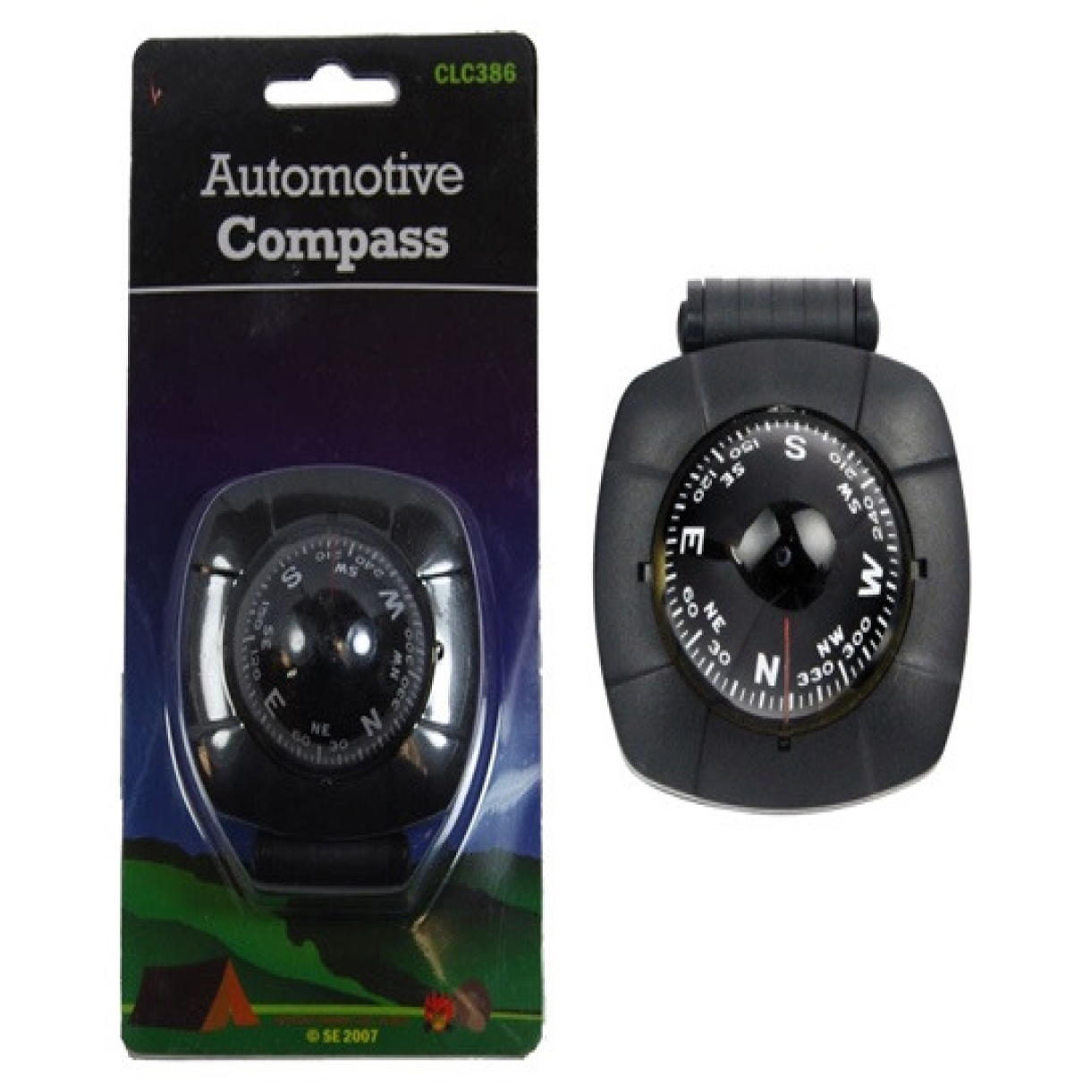 1 1/2" Compass dial, liquid filled. Ball in plastic housing. ABS plastic body with dual mounting base. Double suction base or adhesive tape with non-marking glue. Pivoting base. 2 1/4" W x 2 1/2" H