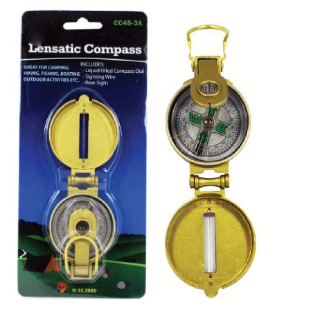 2" Diameter, Metal Body, Bezel Ring, Clicking Bezel Ring, Index Line, 45 Degree Line, Sighting Wire, Rear Sight View, Thumb Loop, North, South, East, West. 2 1/4" L x 3" Diameter