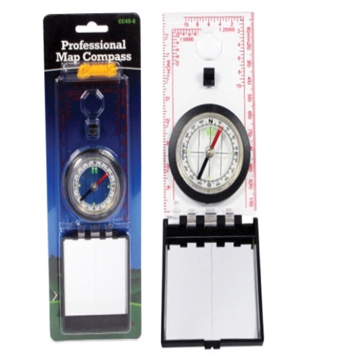 1 3/4" Compass diameter and rotating bezel ring with 249840 graduation, sighting mirror with sighting slot, and clear plastic body. Dual map scales are 1:5,000 and 1:25,000. Also has built-in 4x magnifier for map reading and lanyard. Great for camping, hiking, fishing, and other outdoor activities. 2 1/2" W x 4 1/2" H