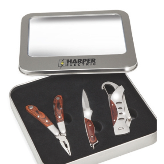 3 piece wood handled steel tool set includes 2 1/4" lockback knife with carabiner, pocket knife with 1 1/2" blade and split ring and spring-loaded mini-pliers with flathead driver, saw, bottle opener and 1 1/2" knife packaged in a windowed tin box. 7" W x 6 3/8" W x 1" D