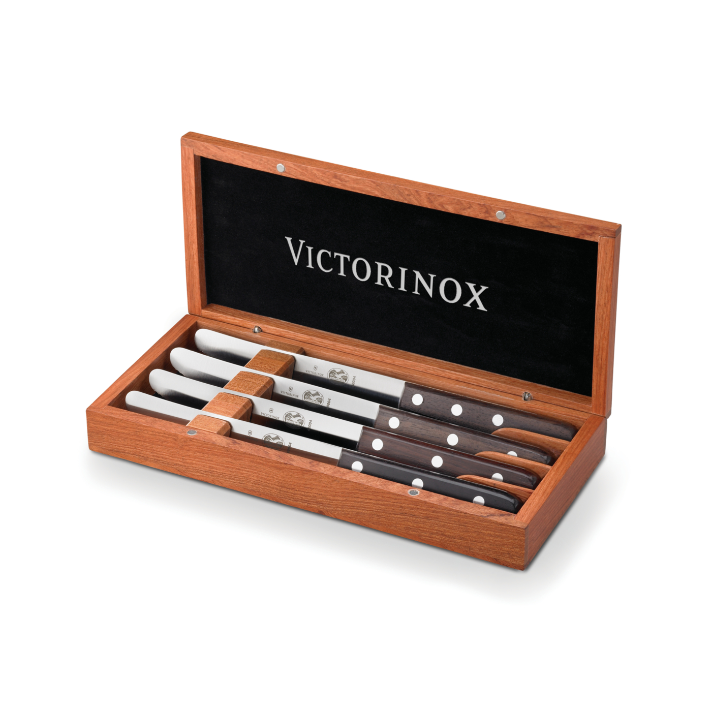 Our 4-Piece Rosewood Steak Knife Set helps you set a perfect table whether you're entertaining friends or making dinner for the family. A perfect way to say thank you, this set can be stored in the included handsome wood box, and the natural beauty of our Rosewood design is ergonomic, lightweight, balanced for extended use, and will not discolor or corrode. Laser engraving available on box and blades. Made in Switzerland