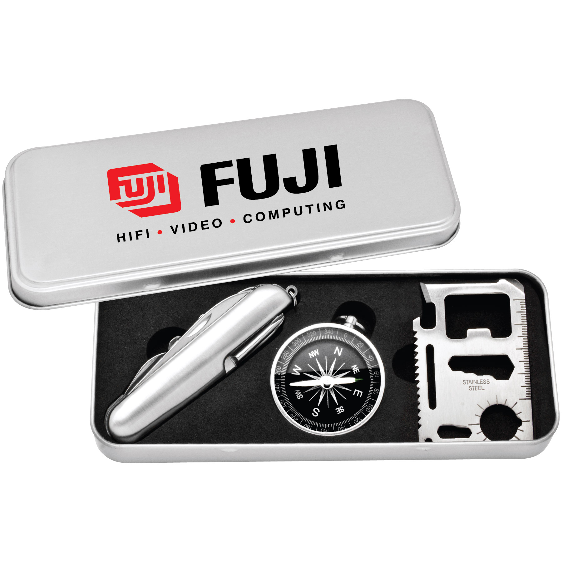 Features an 11 function stainless steel camping tool, 9 function stainless steel knife, and magnetic pocket compass with key ring. Packaged in a 2 piece metal case. 3 1/2" H x 7" W x 1" D