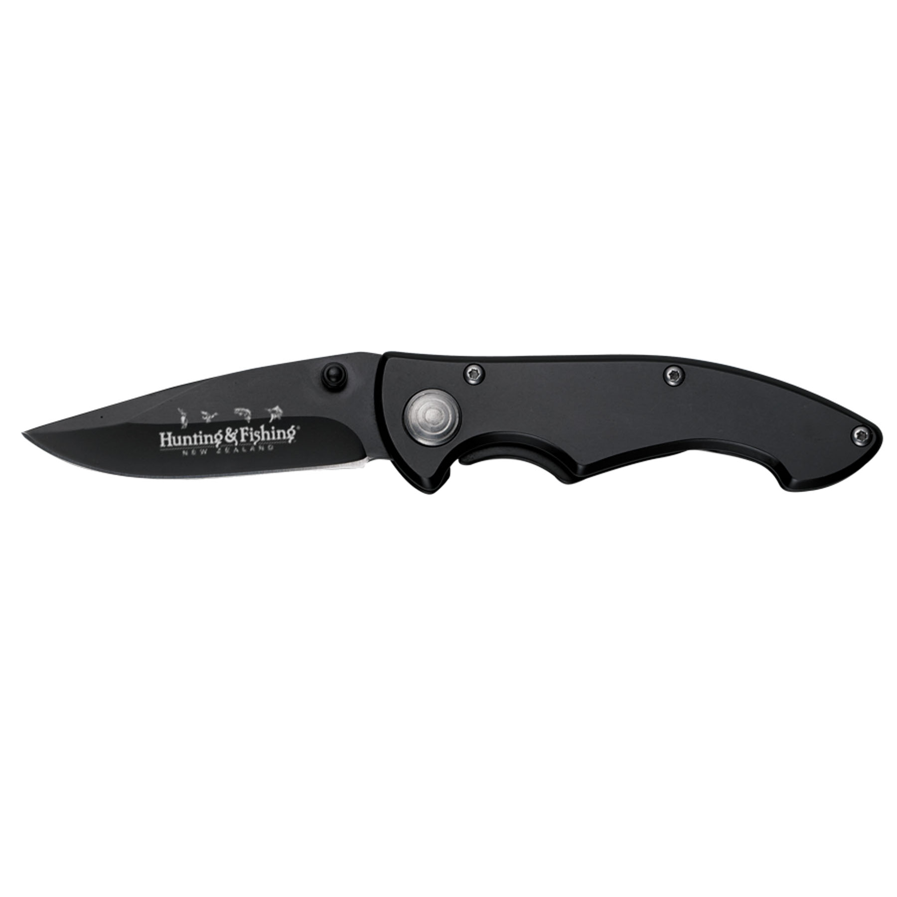3 3/4" black stainless steel handle with 2 1/2" black stainless steel blade. Laser engraving appears white and boxed.
