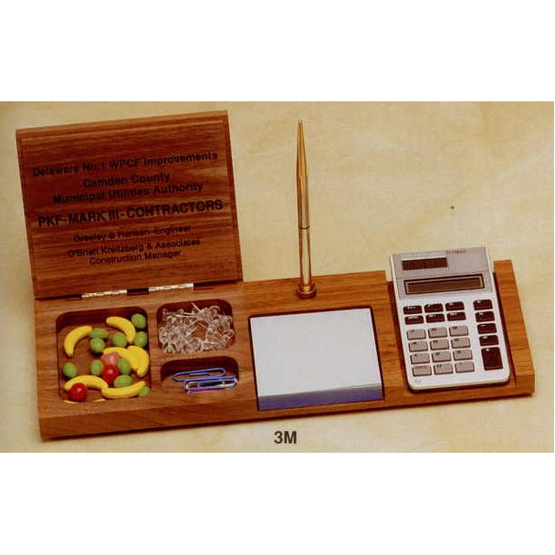 5"x12", Pen, Calculator, 3"x3" Pad, Walnut, Wood. 5" W x 12" L