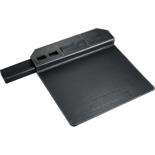 This unique design takes the traditional mouse pad into the 21st century by offering storage solutions for your modern devices to allow you to keep them within reach while you work. This mousepad offers spots for your business cards, two flash drives and a stand for your smartphone or cell phone. You can even slide your compatible docking station (not included) into place to allow you to charge while you work. Compatible with iPhone and most other Smartphones 3" wide and narrower. 9.75" H x 10" W x 1" D