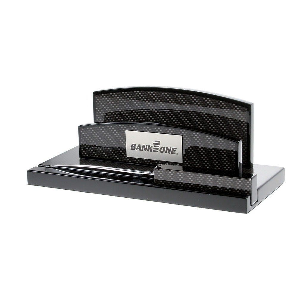 Executive desk set that includes a base letter holder with letter opener. Base and letter opener handle come in a glossy black lacquer finish with carbon fiber design. Additional component engraving is available upon request. Please ask for details. 9.5" L x 4.5" W x 3.75" H