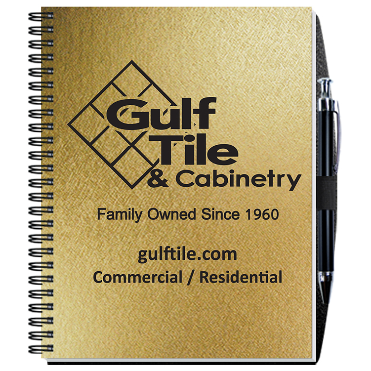 Sturdy heavyweight cover, foil stamped in one standard color. Pen safe back with elastic closure/bookmark and pen loop. Includes Dynamic Pen inserted in loop. Sheets are 60 Lb. white offset, with light gray rules printed on both sides. No extra charge for logo in one standard color on front of each sheet with rules on back (qty 1000+) OR 2 color printed one side with blank back. Wire-O bound on left side in black, pewter, or white. Choice of graph, rule, or blank sheets. 50 cover colors. 6.5" W x 8.5" H