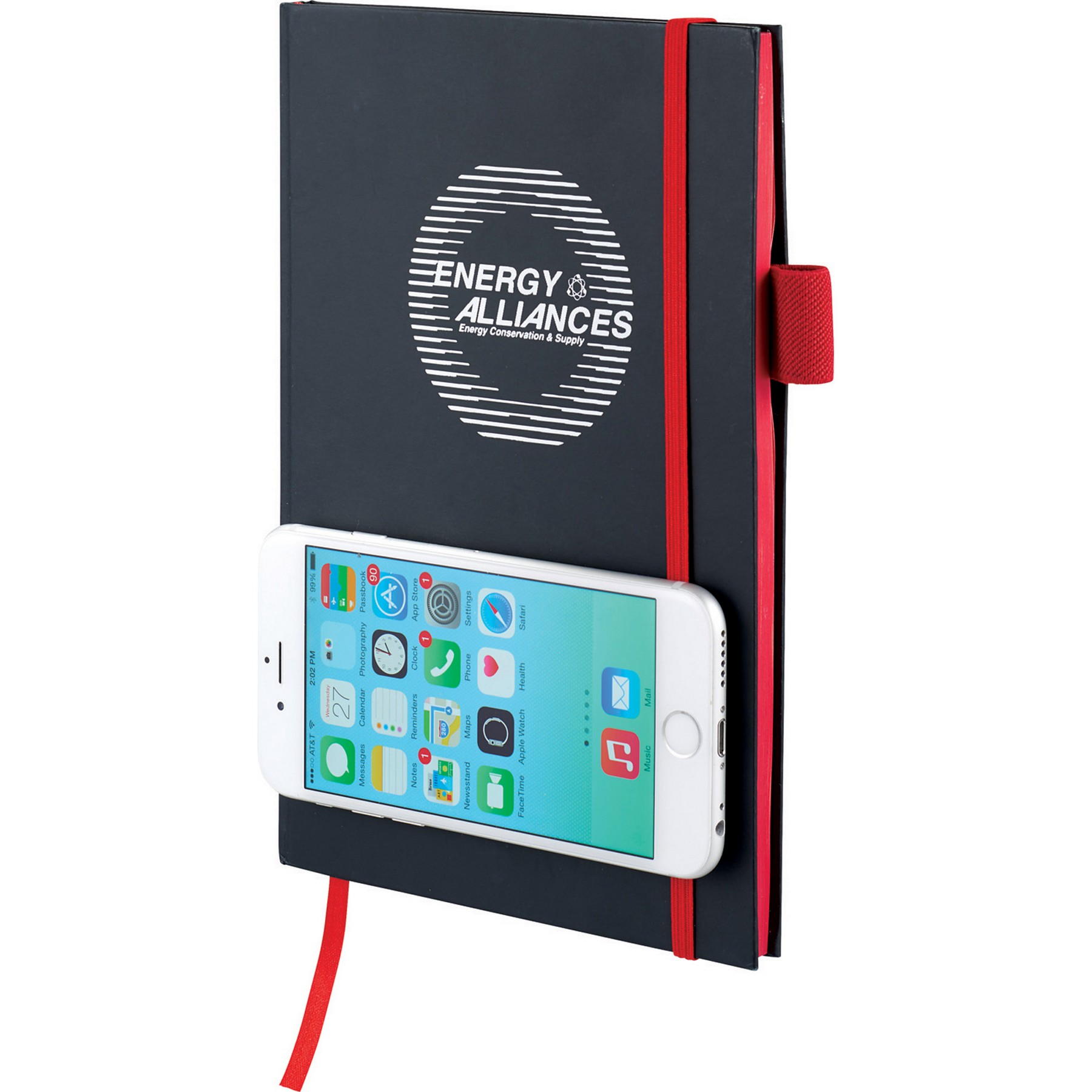 This exclusive design will be sure to brighten up your day and conveniently hold your smartphone with it's suction cup panel. Soft matte black cover highlights the most subtle or colorful logos. Includes 80 sheets of lined paper with bright colored painted edges. Includes corresponding color elastic closure and pen loop. Suction panel holds most smartphones. 8.25" H x 5.5" W