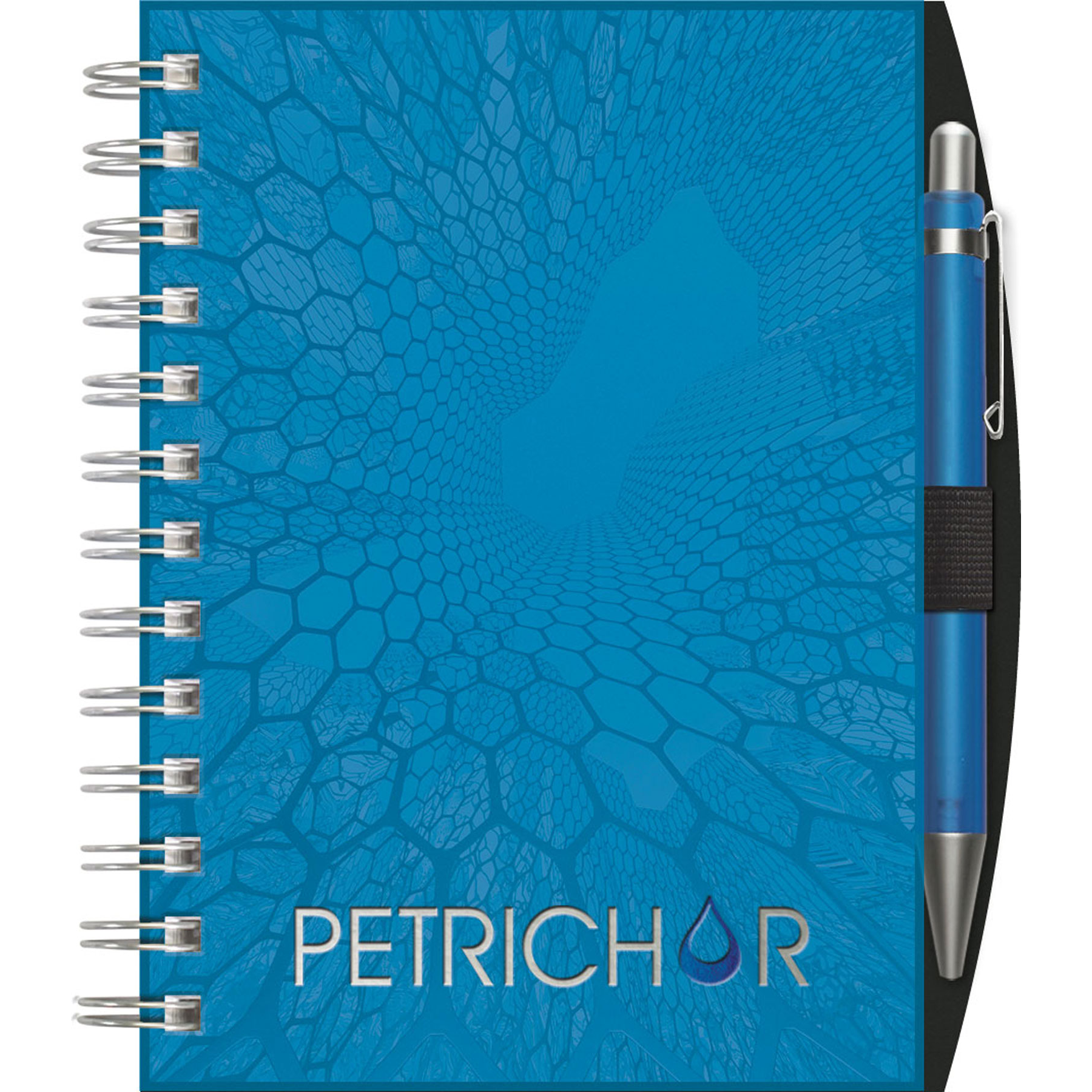 Smooth, vinyl Flex front cover (available in Frost, Red, or Sea Blue) with black paperboard back cover. Includes 1-color foil imprint (no deboss available). Comes with (1) blank white insert at front. 100 sheets of lined filler - blank or graph also available. Black wire binding is standard. Image is showing with optional PenPort with Blue Deluxe Pen and a 1-sided Full-color (4/0) insert. Made in the USA. Complies with FSC. 5" W x 7" H