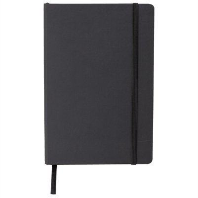 Leatherette covered junior size journal with 60 lined cream color pages, elastic closure, bookmark ribbon and pocket. 5 3/4" W x 8 1/2" H x 3/4" D